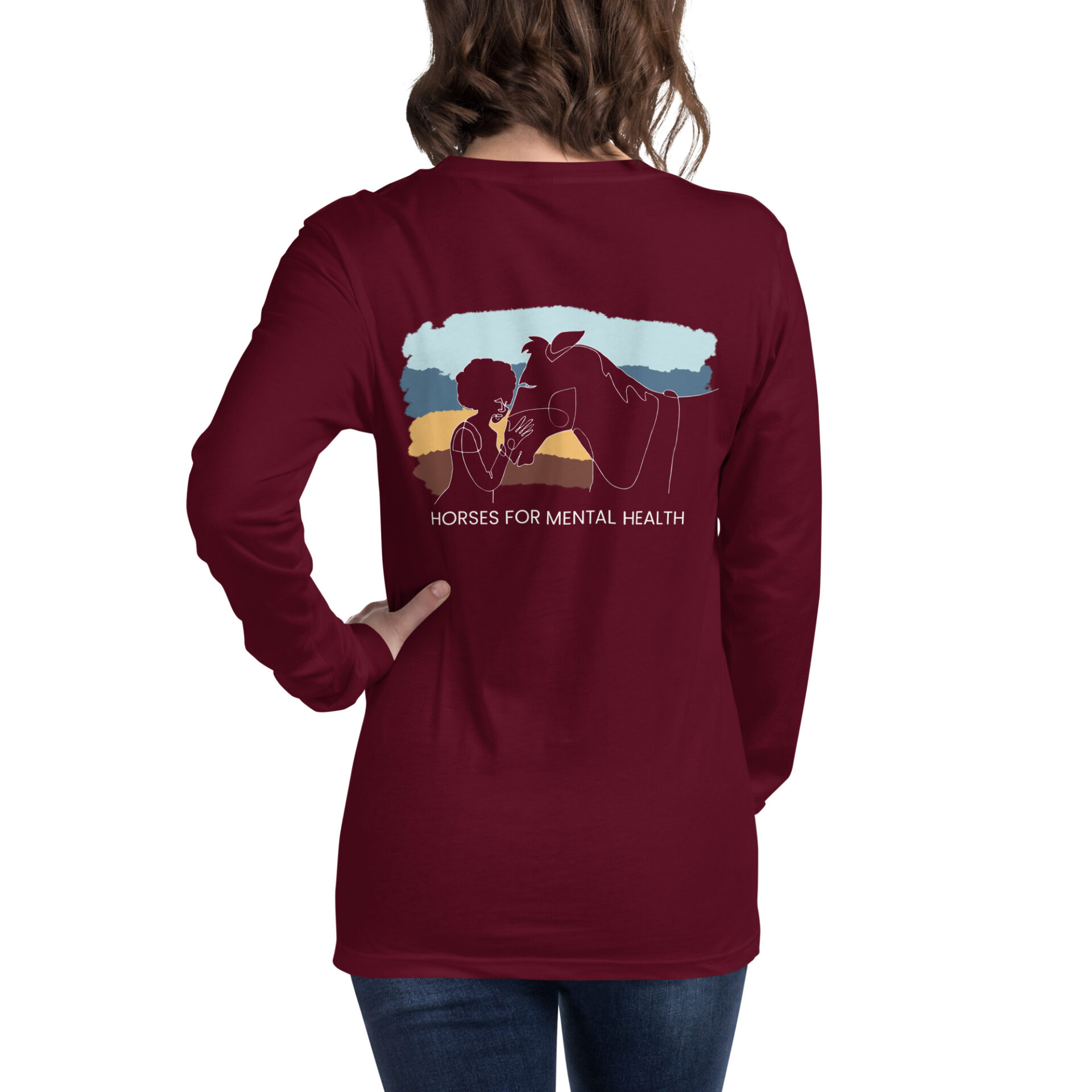 Amplify awareness of how horses help so many transform their lives. This soft long-sleeve t-shirt features a colorful image from one of the HMH Campaign videos, “Finding Her Voice,” on the back, with a left pocket logo of the HMH Campaign on the front.